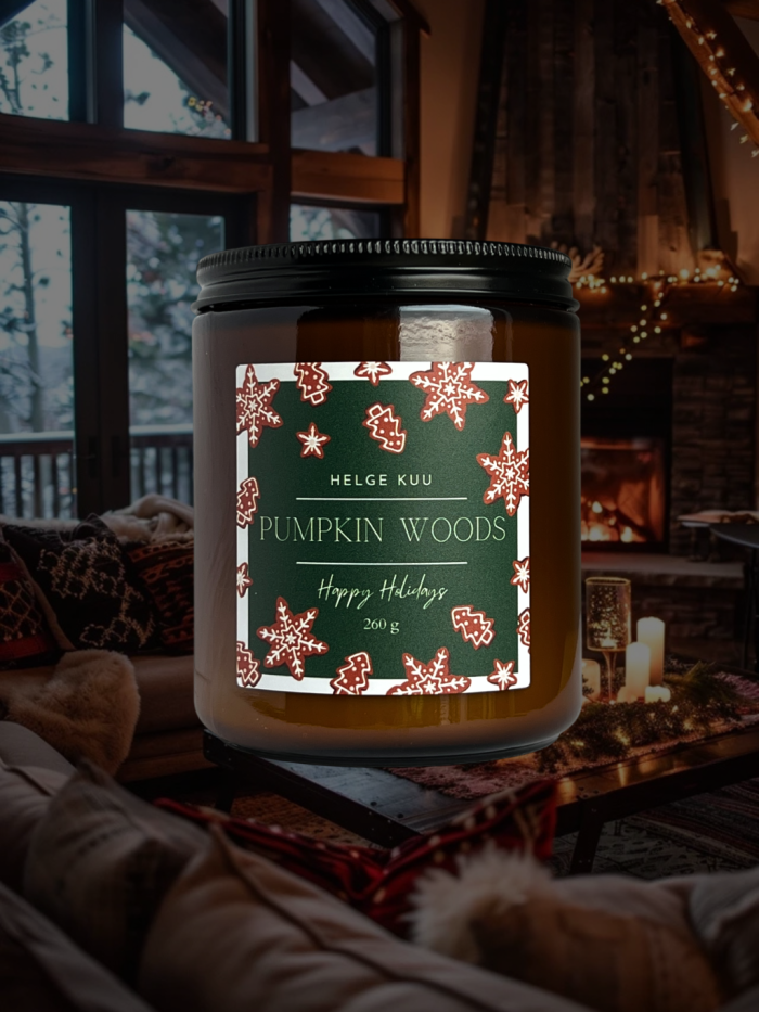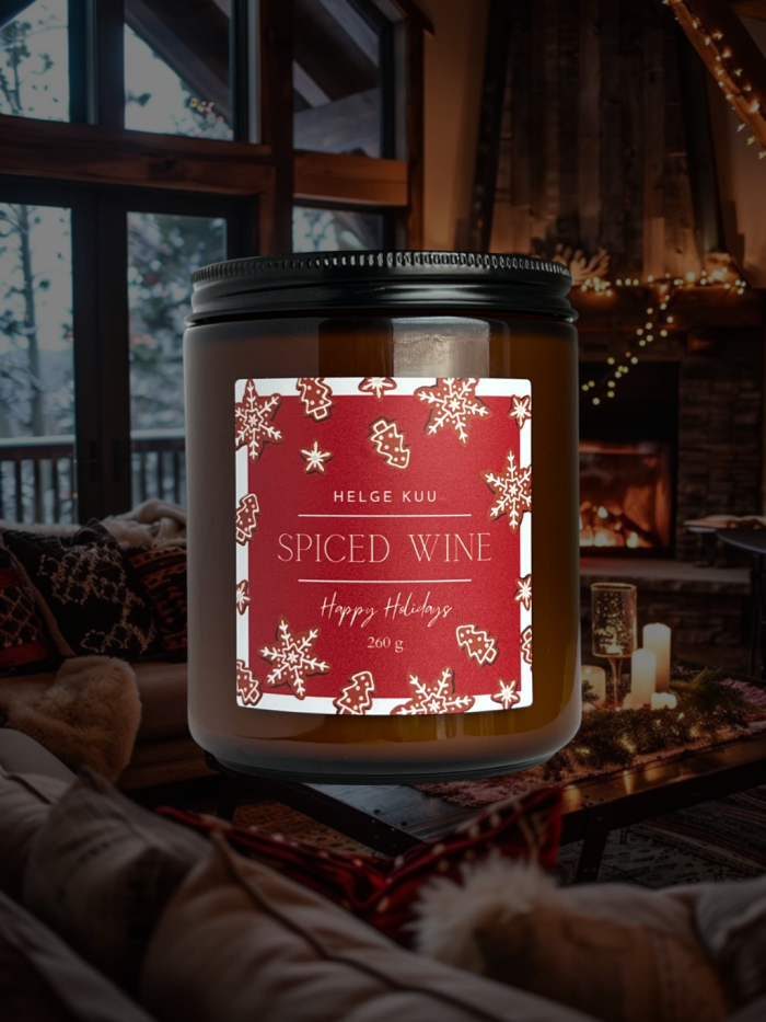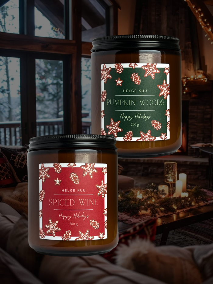 Helge Kuu pühadeküünal 2025. Saadaval kahes imelises aroomis – Spiced wine ja Pumpkin woods. Erakordselt mõnusad ja jõululikud aroomid, ilma lääge piparkoogi lõhnata!